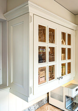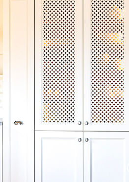 Des détails tels que les pilastres, les corniches ou les éléments hauts vitrine à verre biseauté et l'armoire vaisselier en treillis semi-ajouré, ont été pensés pour respecter les codes de la cuisine classique, mais toujours avec une volonté de modernité puisque que ces deux derniers éléments sont équipés de lumière LED intérieure et extérieure.